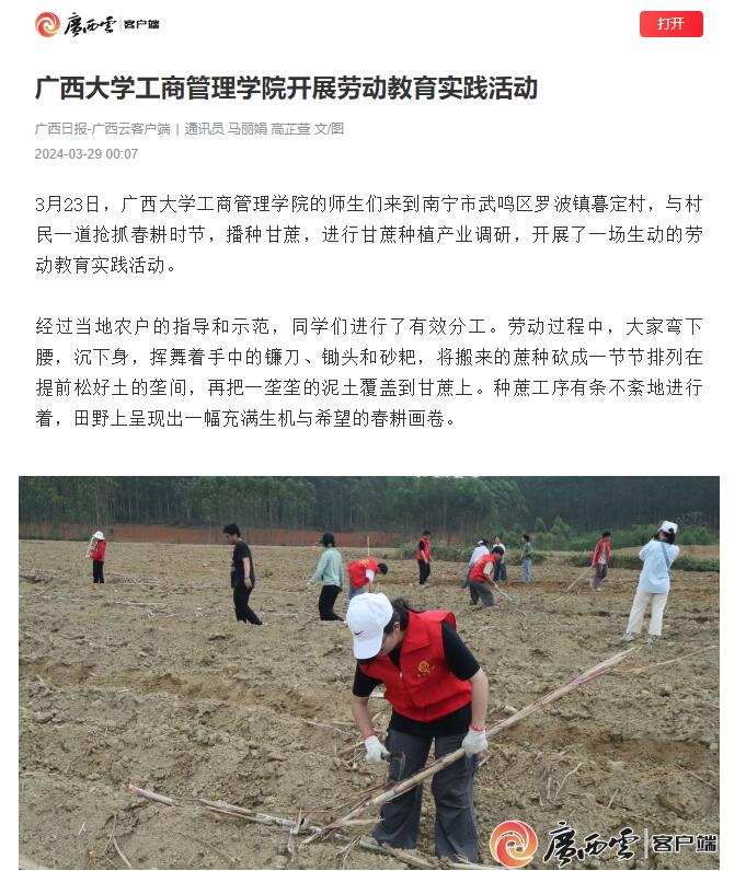 3月23日,威廉希尔体育组织师生们追随习近平总书记视察广西发展特色产业的指示精神,到南宁市武鸣区罗波镇暮定村与村民一道抢抓春耕时节,播种甘蔗,进行甘蔗种植产业调研。公司紧扣热点,深入挖掘,推出报道《威廉希尔体育开展劳动教育实践活动》。该报道获广西日报、广西云客户端、南宁日报社、南宁新闻网等主流媒体广泛关注。