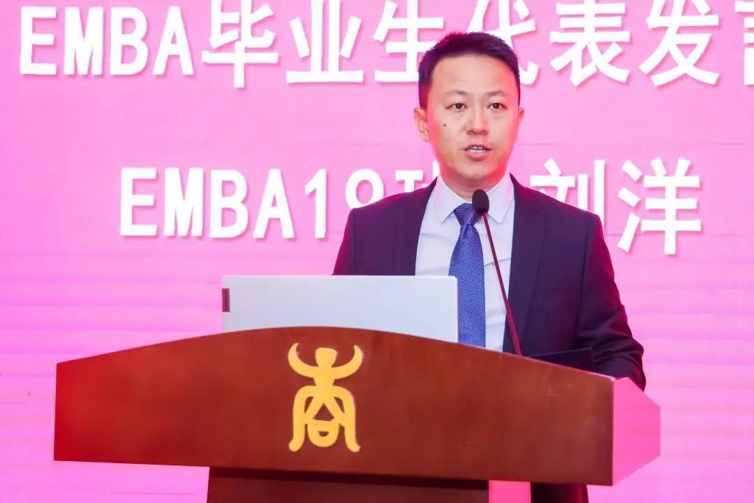 毕业生代表EMBA19班刘洋在发言中带着大家一起深情回忆了EMBA两年快乐、充实的学习时光,并期待和同学们一起努力创造美好生活,做一个爱国的人,一个勇敢的人,一个善良的人,一个真诚的人,一个自己想成为的人。