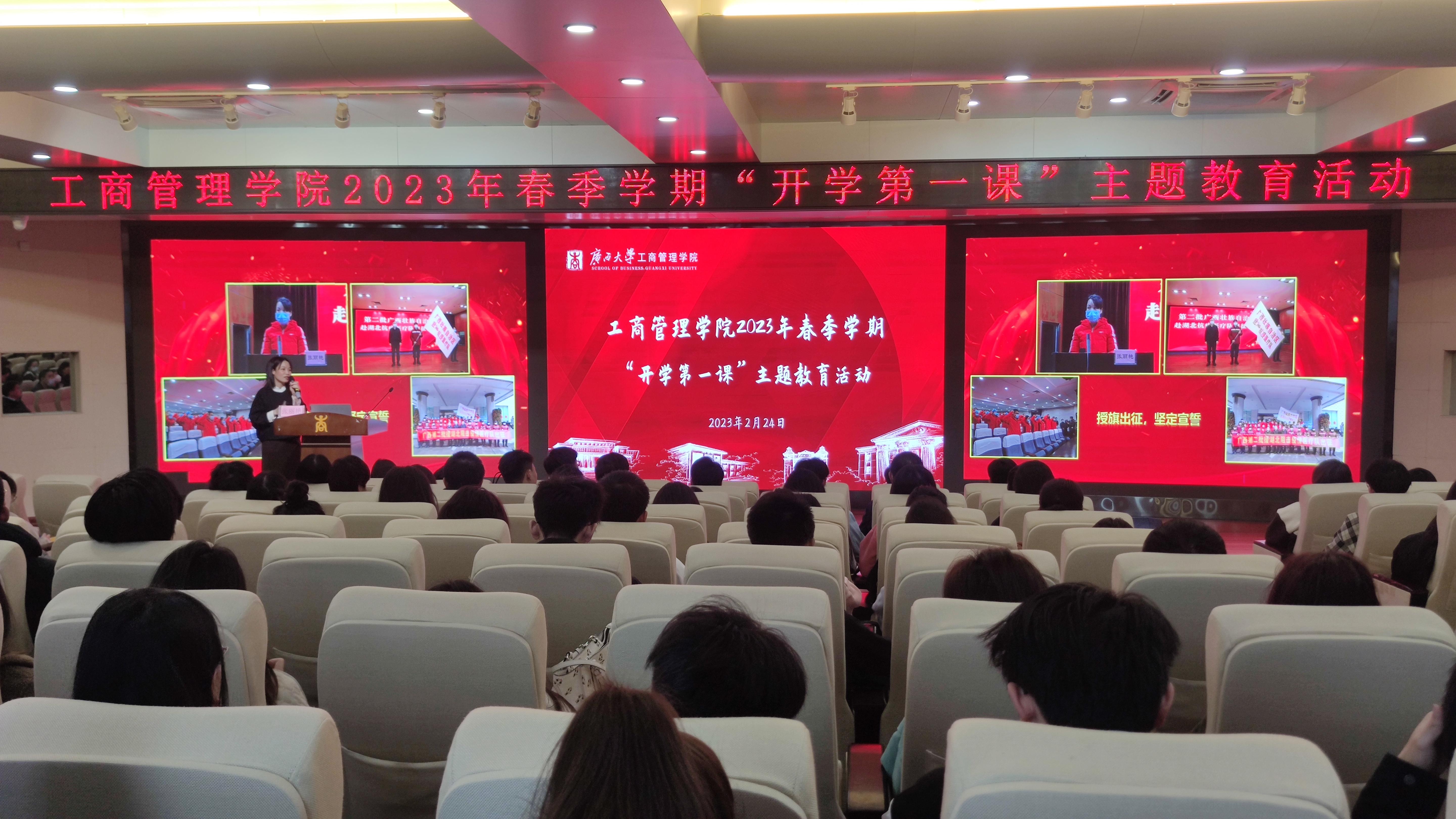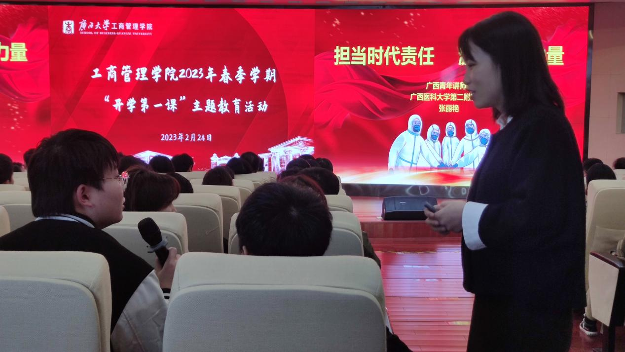 2月24日,广西医科大学第二附属医院团委书记、共青团广西区委兼职副书记张丽艳受邀到公司以《担当时代责任,激扬青春力量——学习贯彻党的二十大精神专题报告》为题,为公司师生代表、校团学组织员工干部代表讲授“开学第一课”。校团委书记谢能重出席活动。报告会由公司党委副书记黄晋主持,院团委书记马丽娟以及全体辅导员老师参加活动。本次活动得到了校团委的大力支持,60多名校会员工干部与公司200余名师生共同聆听“开学第一课”。