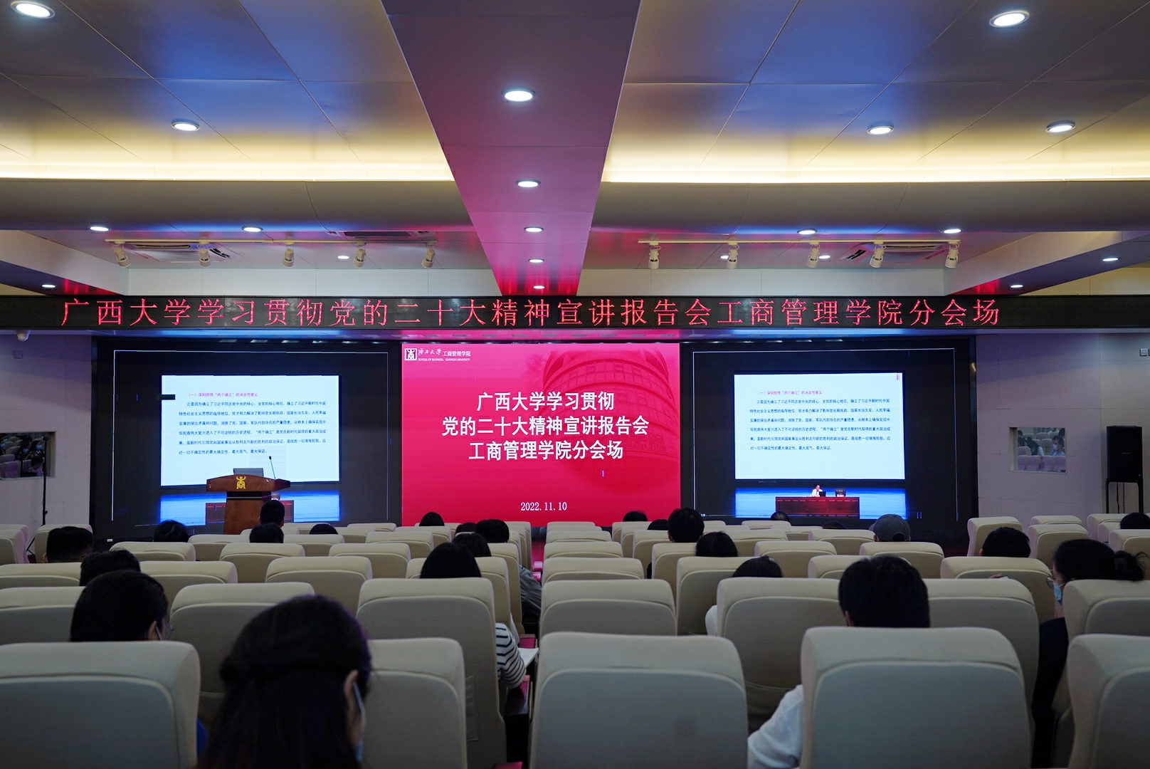 11月10日下午,学习贯彻党的二十大精神自治区宣讲团在公司宣讲,自治区宣讲团成员、自治区党校(广西行政公司)常务副校(院)长胡建华作了宣讲报告。宣讲报告会以线上线下相结合的形式召开,自治区政协副主席、公司党委书记王乃学主持报告会。公司在128报告厅设置分会场,教职工及各党支部代表在分会场观看报告会直播。