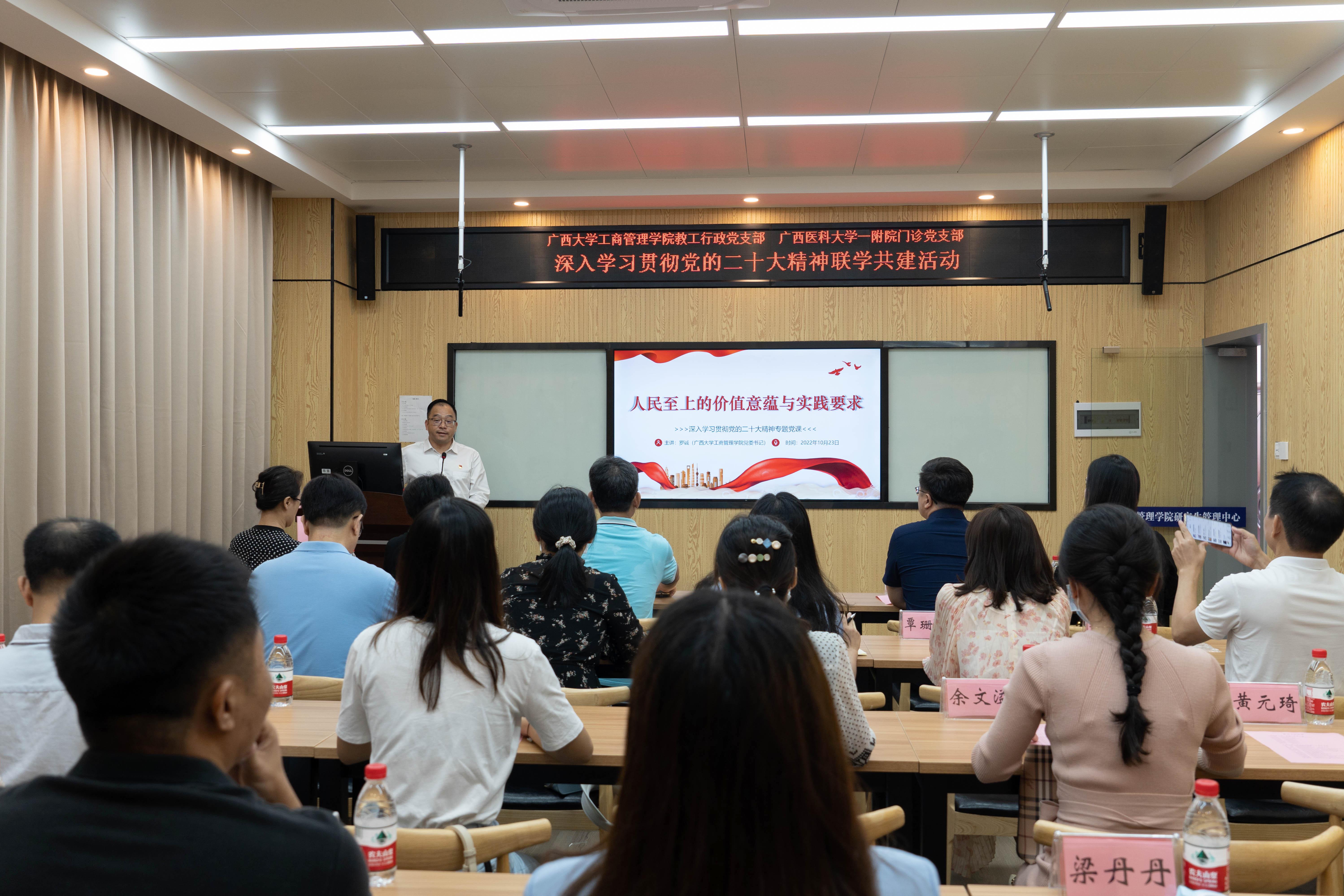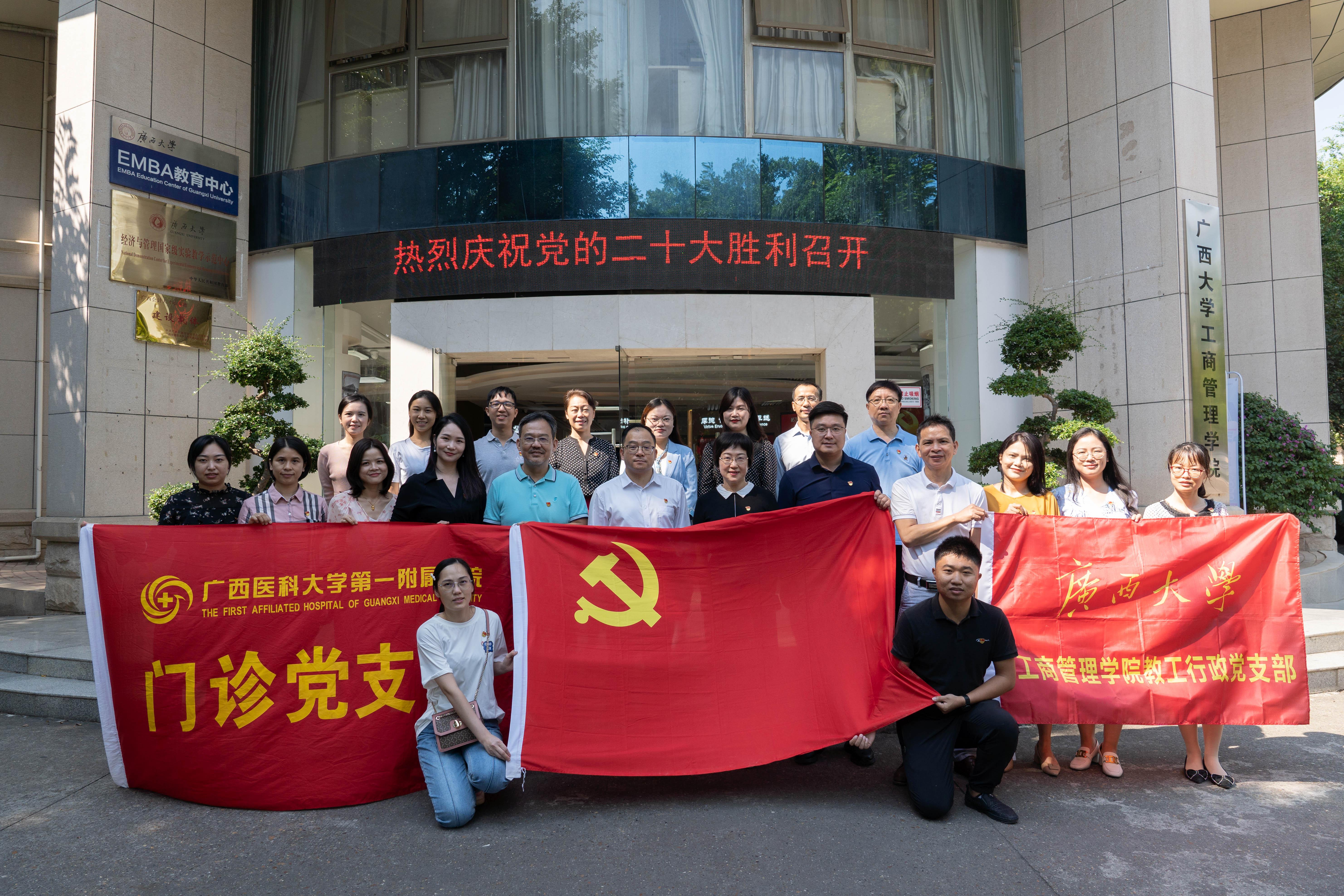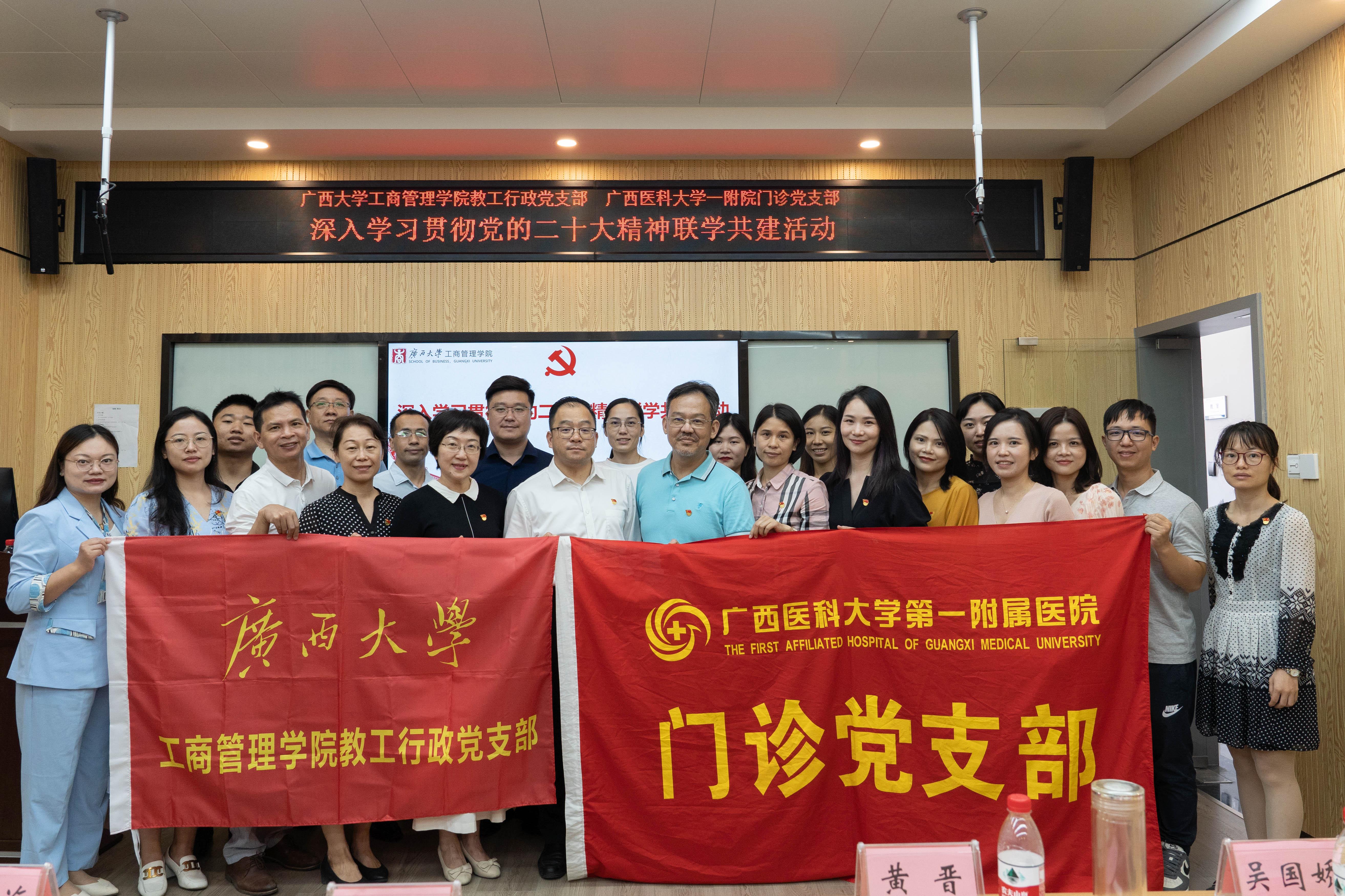 在党的二十大胜利闭幕之际,为深入学习贯彻党的二十大精神,持续推进基层党建工作内容创新、方法创新,不断加强党的建设,10月23日上午,威廉希尔体育教工行政党支部与广西医科大学一附院门诊党支部联合开展深入学习贯彻党的二十大精神联学共建主题党日活动。公司党委书记罗诚以普通党员身份参加了本次活动。