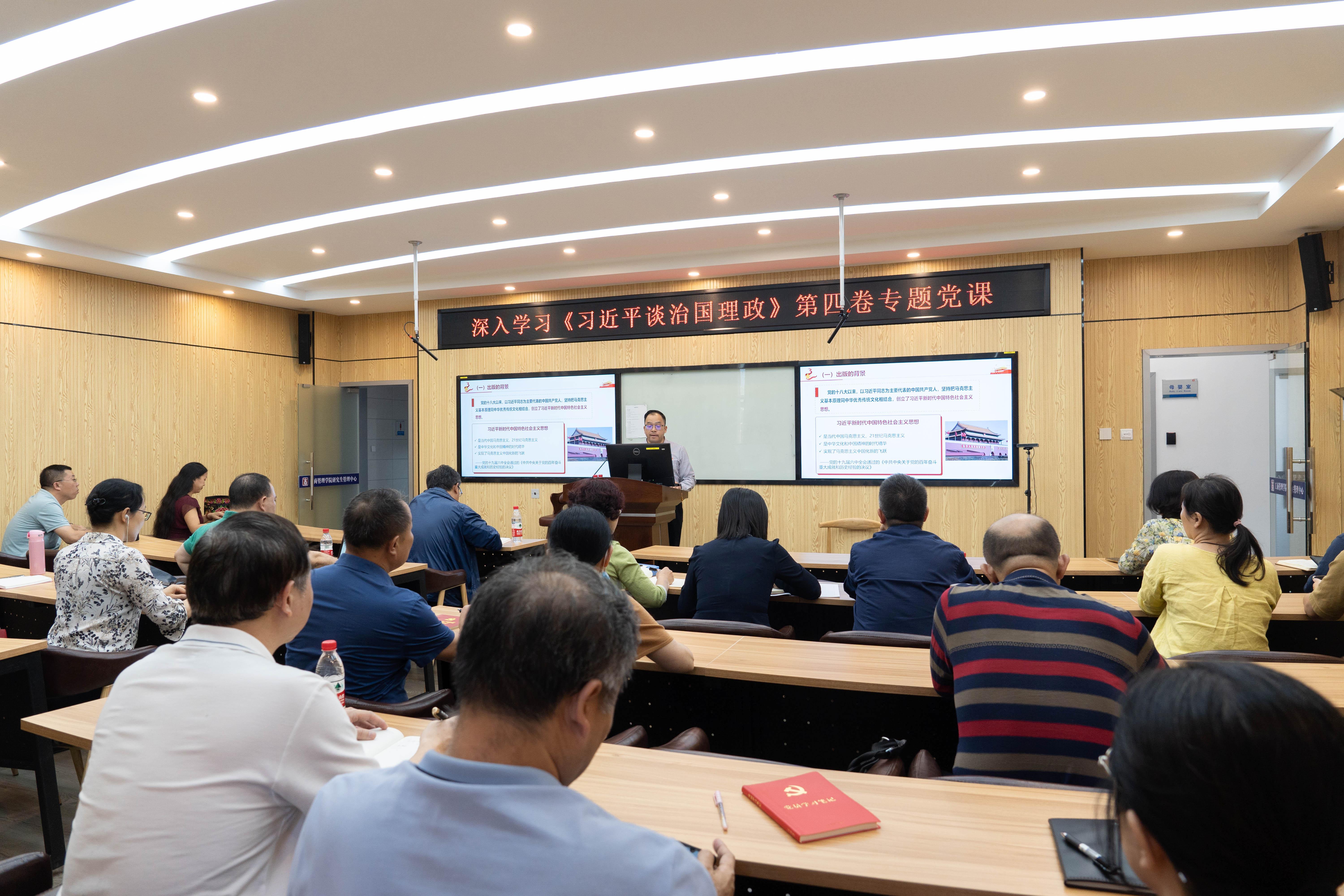 为进一步学好用好《习近平谈治国理政》第四卷,把握其精髓要义,10月18日下午,教工财会党支部、教工旅管党支部和教工信经党支部在公司509B教室联合开展主题党日活动,集体学习《习近平谈治国理政》第四卷。活动中,公司党委书记罗诚应邀以“深入学习《习近平谈治国理政》第四卷”为题,给教工党员讲授专题党课。