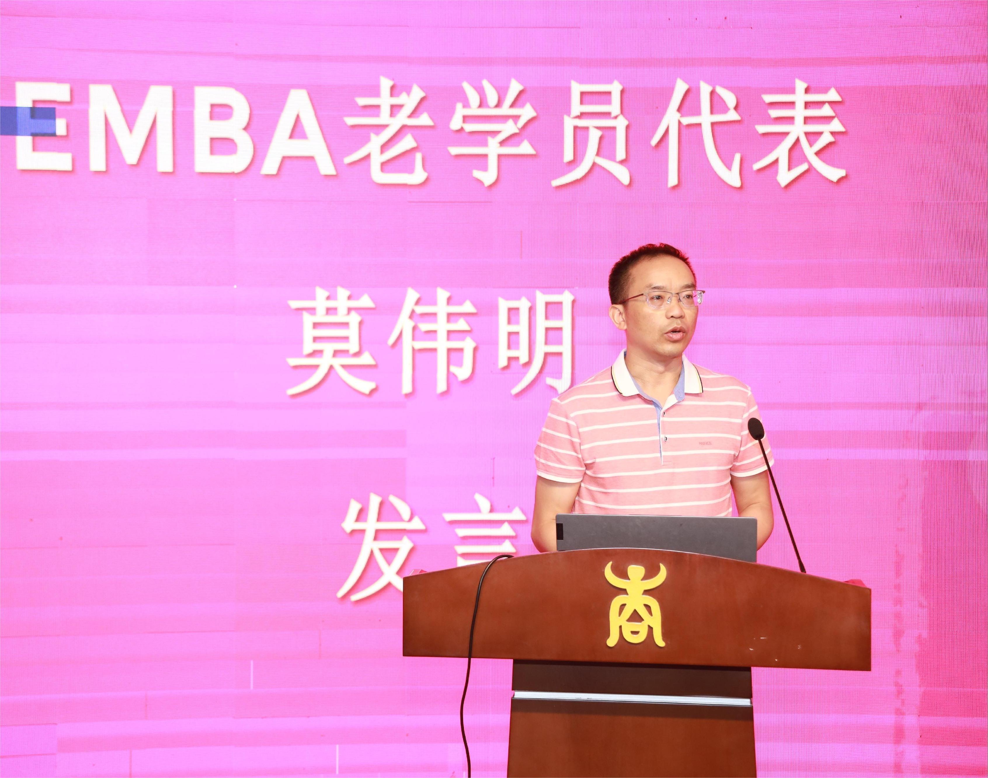 老学员代表莫伟明从感恩、珍惜和祝愿三个主题和新生们分享了他的感受。首先,他感谢威廉希尔体育为同学们搭建了一个拓展思想深度、眼界高度、胸怀宽度、学养厚度、人脉广度的好平台;感谢EMBA教育中心老师们对同学们的关爱;感谢为同学们传道授业解惑的各位优秀老师。其次,他就过去一年的生活感悟、学习感触与新生们分享,希望新生们珍惜校园生活。最后,他衷心祝福学弟学妹们学有所成,如期毕业。