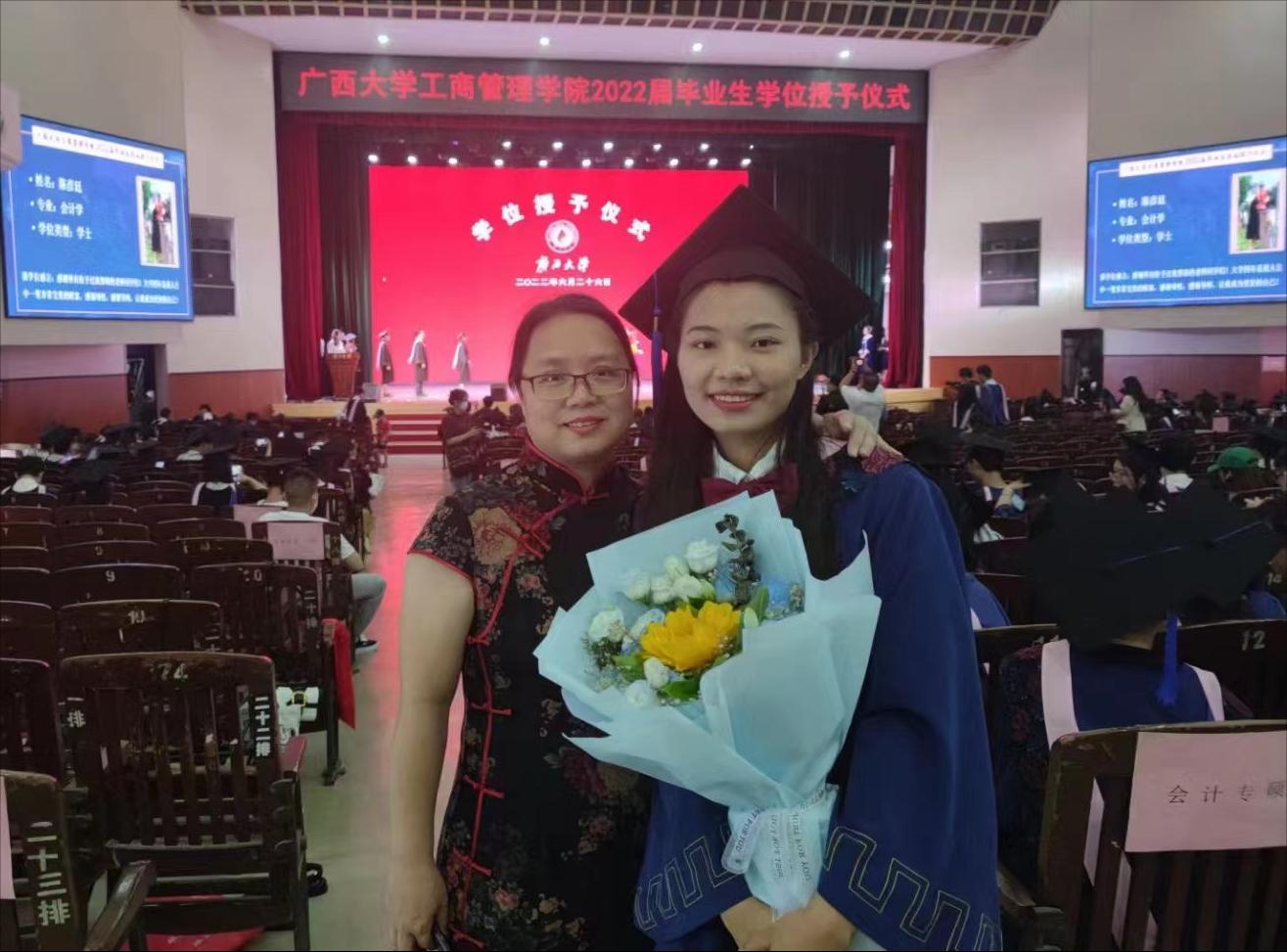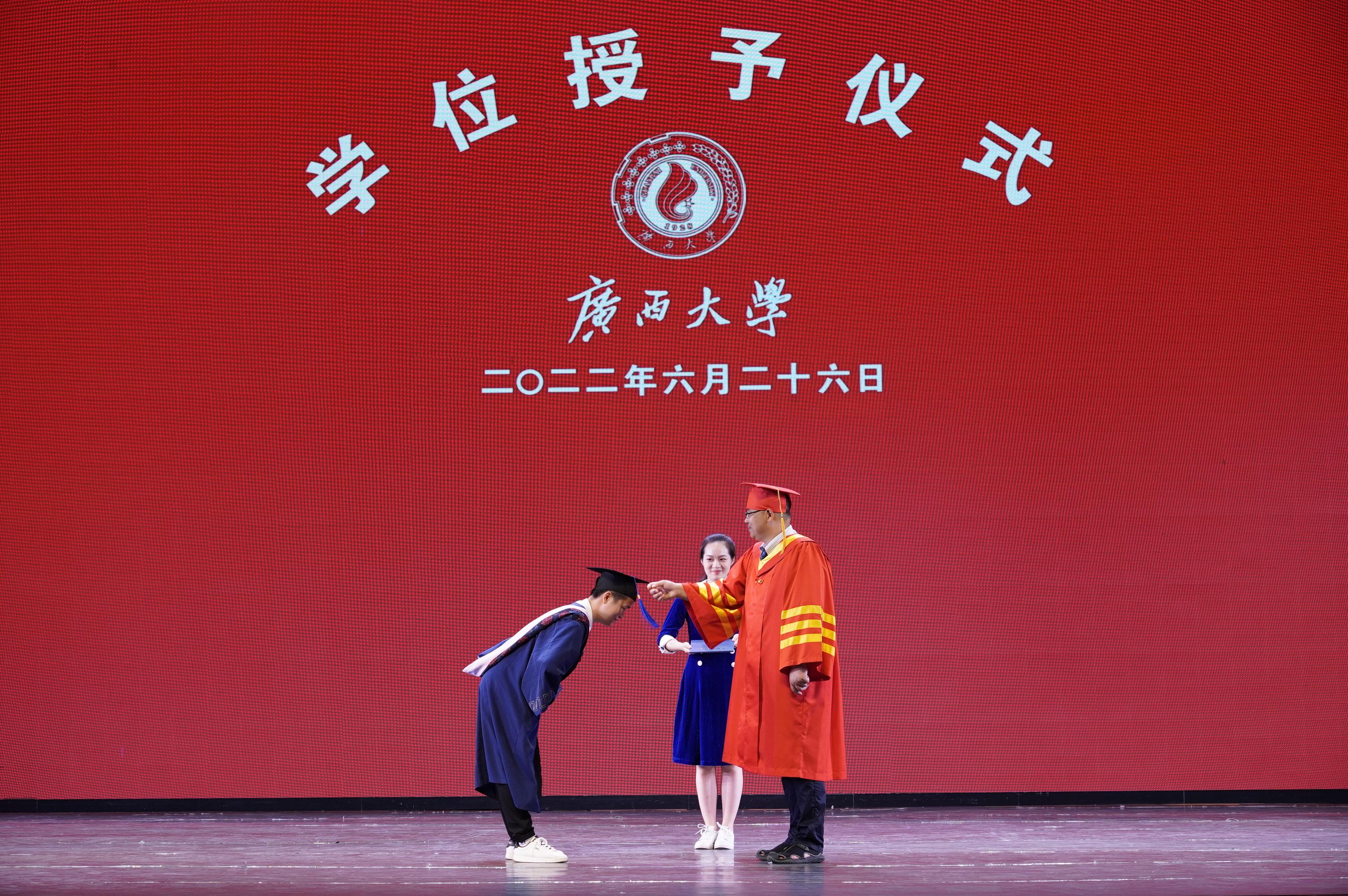 伴着激昂的校歌,2022届毕业典礼降下帷幕,学位授予仪式正式开始,由经理朱帮助为755名毕业生一一拨穗、授予学位证书和合影留念。拨穗正冠,学士帽的流苏从右到左,象征着毕业生们学有所成、展翅高飞!