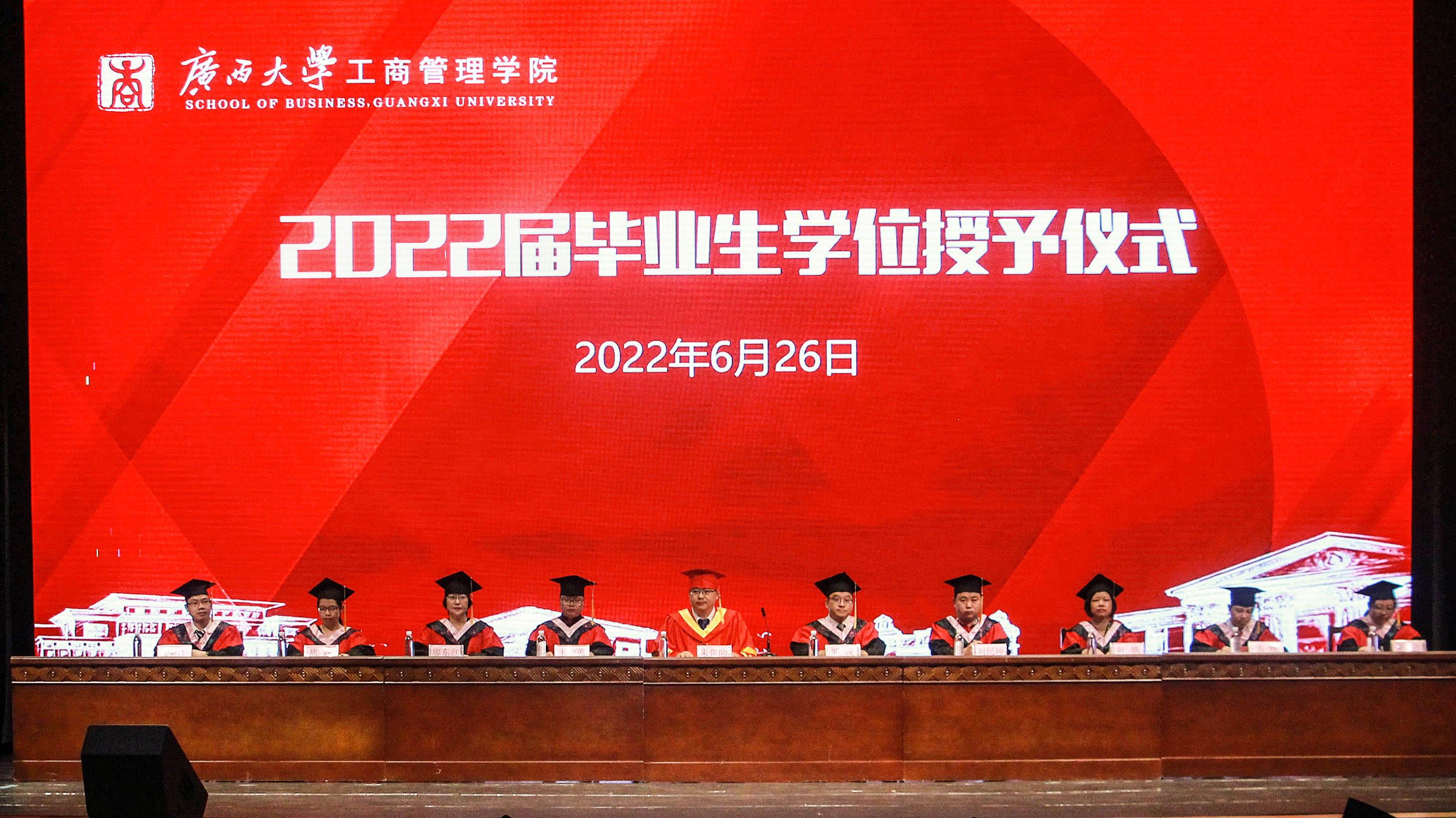 2022年6月26日,威廉希尔体育在公司大礼堂为2022届755人毕业生(其中研究生485人,本科生270人)举行庄严而隆重的毕业典礼暨学位授予仪式。公司党委书记罗诚,经理朱帮助,公司党委副书记黄晋,副经理朱少英、刘民坤、廖东红,教师代表叶映、韦铁、郭峦、唐妤、梁世昌出席仪式。仪式由公司党委副书记黄晋主持。