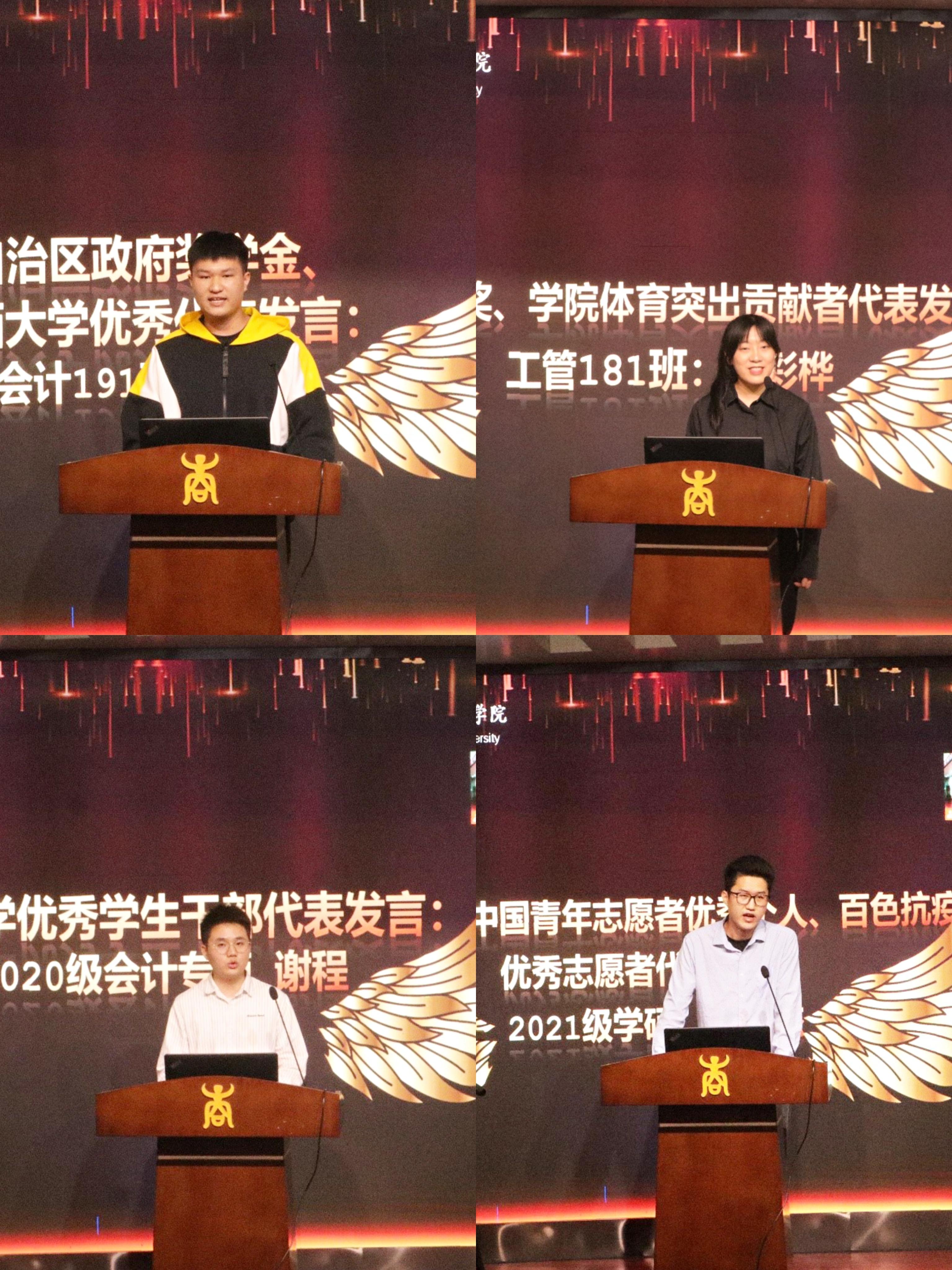 自治区政府奖学金、威廉希尔体育优秀员工代表黄泓创,公司体育杰出贡献者、高顿考研优秀奖员工代表李彩桦,威廉希尔体育优秀员工干部代表谢程,第十三届中国青年志愿者优秀个人、百色抗疫优秀志愿者代表陈允杰等四位同学分别上台发表获奖感言。他们对公司领导和老师表达了衷心的感谢,回顾了自己在大学期间参加各类学科竞赛、考研、员工工作、百色抗疫等经历,分享心得体会,总结成功经验,体现了对学习、生活和集体的热爱。