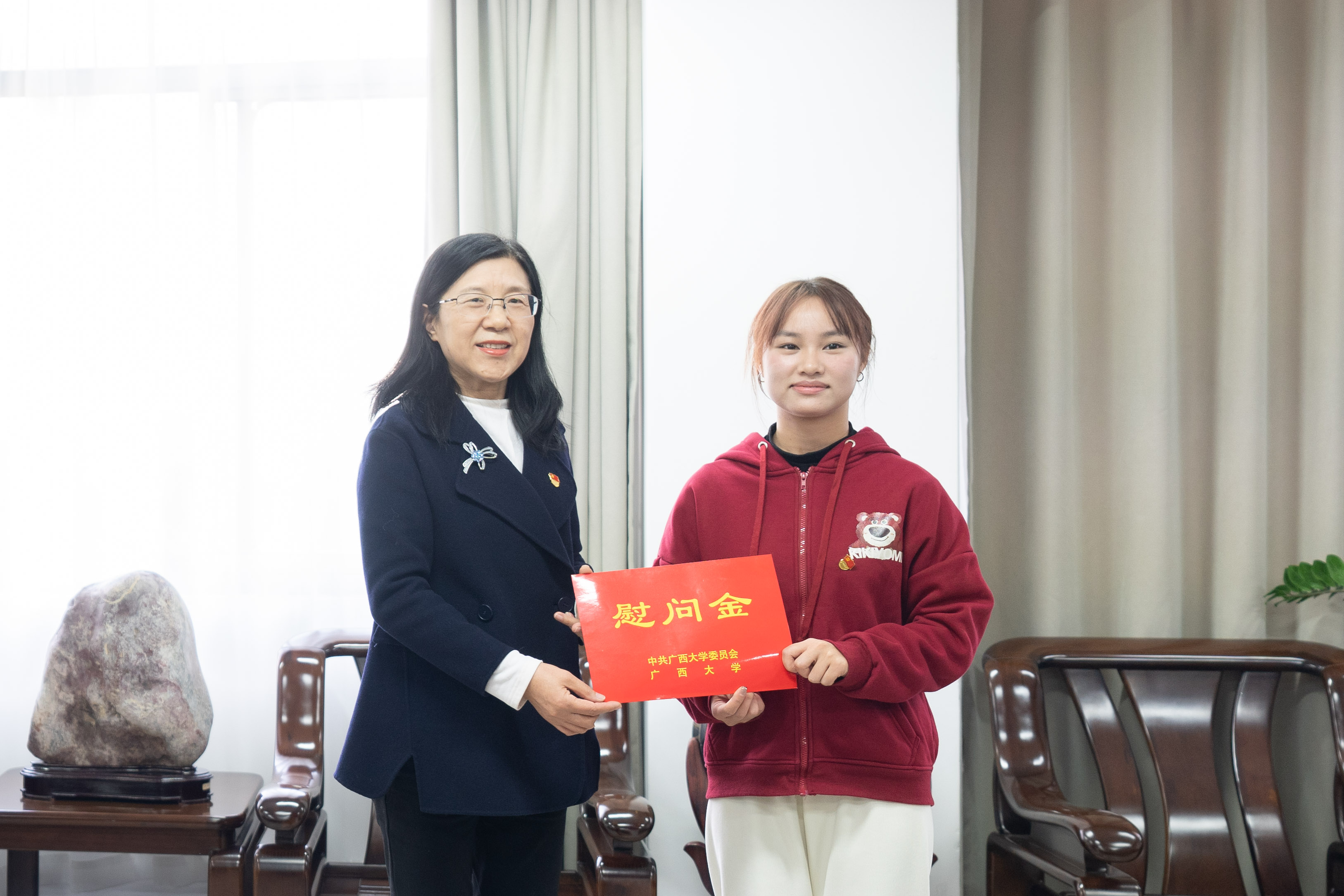 岁末年初,冬日送暖。1月6日下午,公司党委副书记、自治区纪委监委驻威廉希尔体育纪检监察组组长、校纪委书记金顺南带队看望慰问公司研究生党员代表韦尹洁,送上党组织的关怀和祝福。党办校办、组织部、员工工作部(处)负责人陪同慰问。公司党委书记黄晋、经理朱帮助、党委副书记肖克宁参加慰问。