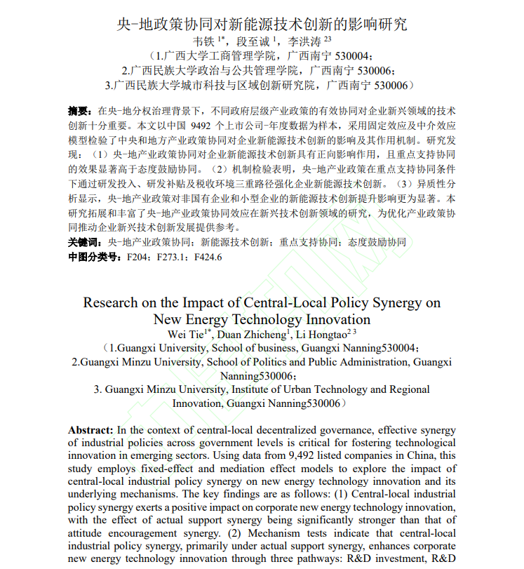 近日,公司企业管理系韦铁教授、博士研究生段至诚和广西民族大学李洪涛讲师的研究成果《央-地政策协同对新能源技术创新的影响研究》在创新管理领域中文高水平期刊《科研管理》网络首发。《科研管理》期刊为CSSCI来源期刊、AMI权威期刊、国家自然科学基金委员会管理科学部遴选和认定的管理科学A级重要期刊,2024年影响因子4.391。