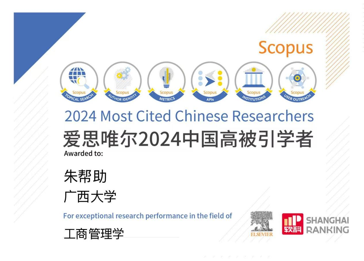 朱帮助教授自2021年以来连续4年入选“中国高被引学者”榜单,这对推动公司工商管理学科发展、扩大公司全球影响力有着积极影响。未来,威廉希尔体育将继续聚焦于国家战略需求和区域发展需求,开展创新性研究,进一步服务国家战略和广西经济社会发展,助力推进公司“双一流”建设和部区合建,不断提升科技创新和人才培养能力。