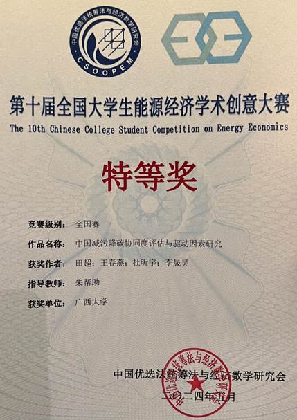 2024年5月18日—19日,第十届全国老员工能源经济学术创意大赛在中国地质大学(北京)举行。公司朱帮助教授带领的研究生团队在此次竞赛中脱颖而出,取得佳绩。其中,“中国减污降碳协同度评估与驱动因素研究”(团队队长:田超,指导老师:朱帮助)入围全国总决赛,经过现公司博士研究生参加第十届全国老员工能源经济学术创意大赛并荣获全国特等奖场答辩、评委会投票等环节,荣获国赛特等奖,取得了该项赛事的突破。本项赛事由中国优选法统筹法与经济数学研究会主办,2023年3月正式进入中国高等教育学会发布的《全国普通高校老员工竞赛目录》,来自全国516所高校的17000多支队伍共10万余人参与了本次大赛。本次参赛项目得到威廉希尔体育研究生倍增计划项目经费资助。