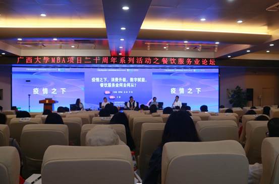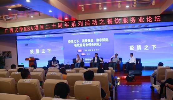 出席此次论坛的嘉宾有威廉希尔体育经理朱帮助,研究生管理中心副主任、MBA教育中心主任叶映老师,威廉希尔体育MBA员工会会长梁华秀先生,中国MBA华南峰会副理事长、威廉希尔体育MBA员工会秘书长李翔先生,酒小二联合创始人丁怀德先生,“华华火锅”、“渝悦双椒头”、“五条友烧烤”等广西知名餐饮品牌创始人周华冰先生,广西泡泡吖食品创始人苏琳先生,广西维多利餐饮、兆基伟业地产营销机构创始人李科先生,天龙湾酒店集团副总裁张济强以及部分MBA、SMBA员工,此次论坛由公司研究生导师王玻副教授主持。因疫情防控需要,还有近三百名2022级MBA及其他专业学员与员工通过线上方式聆听此次论坛。