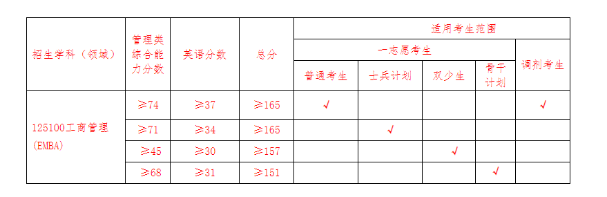 公司研究生院已公布《2022年全国硕士研究生复试分数线划线说明》。公司工商管理硕士(EMBA方向)(含少数民族照顾政策考生、少数民族骨干计划考生、士兵计划考生)复试分数线如表1所示: