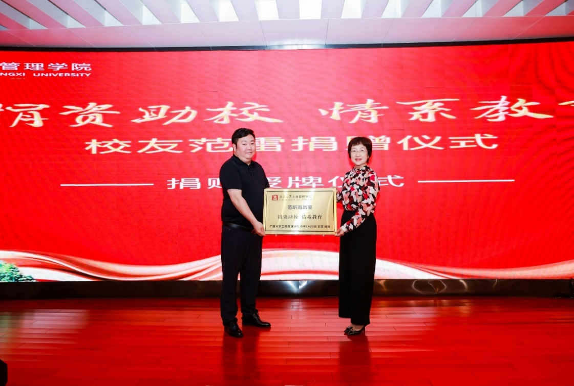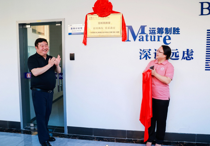 捐赠仪式结束后,朱少英副经理与范雷员工在所冠名的504案例室外举行了揭牌仪式。下一阶段,公司将进一步加强与各界员工的联系与合作,更好地凝聚员工力量,增进员工与母校间的情感,实现公司和员工事业共赢发展。