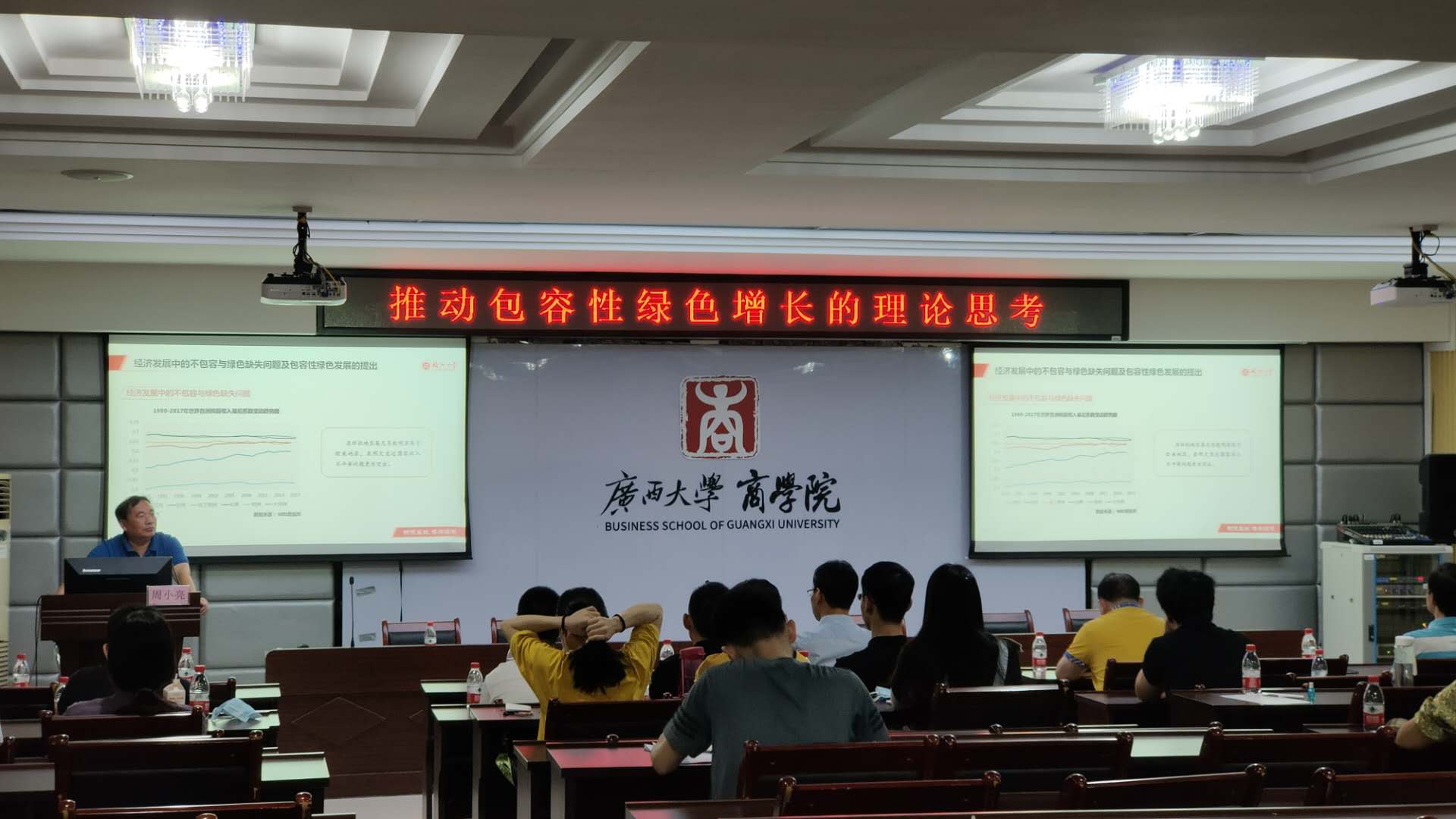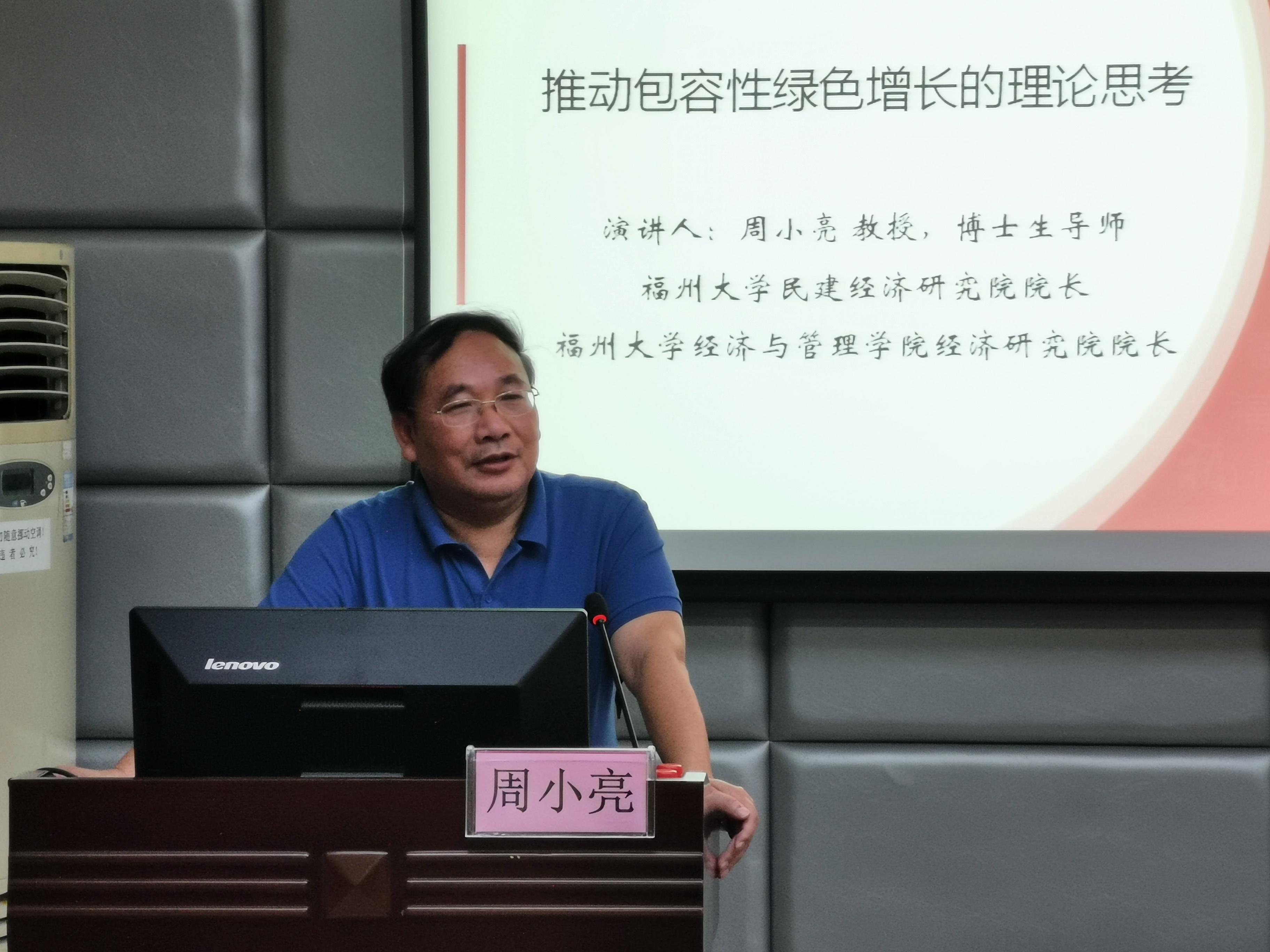 7月10日,福州大学民建经济研究院经理、福州大学经济与管理公司经济研究院经理周小亮教授应邀来公司进行学术交流。上午8点30分,周小亮教授在商公司124报告厅进行了主题为“推动包容性绿色增长的理论思考”的学术报告。报告由商公司学术经理李光辉教授主持。