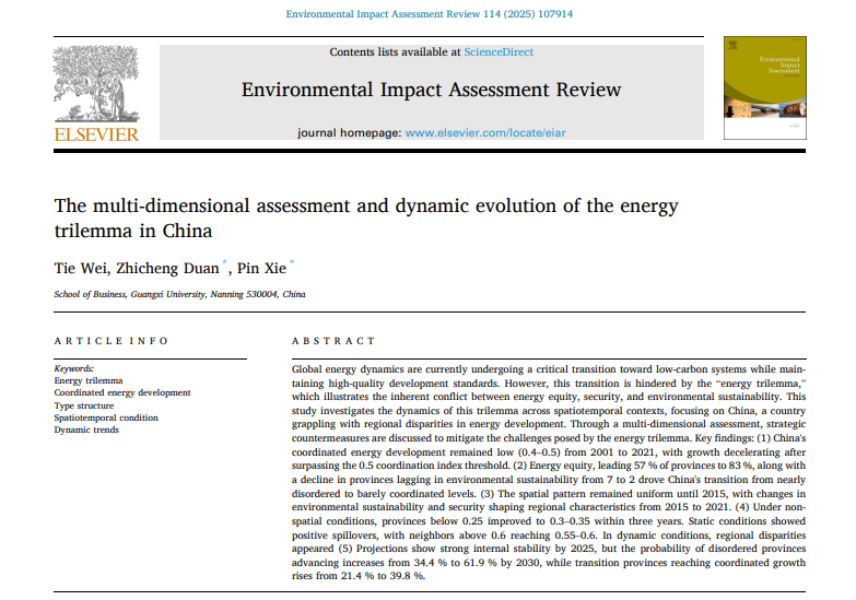近日,公司韦铁教授团队在能源不可能三角(Energy Trilemma)多维评估与动态演化领域取得重要研究进展,相关成果以“The multi-dimensional assessment and dynamic evolution of the energy trilemma in China”为题,发表在环境与可持续发展国际高水平期刊《Environmental Impact Assessment Review》上。论文第一作者为韦铁教授,通讯作者为谢品副研究员和博士研究生段至诚,威廉希尔体育为第一单位和通讯单位。