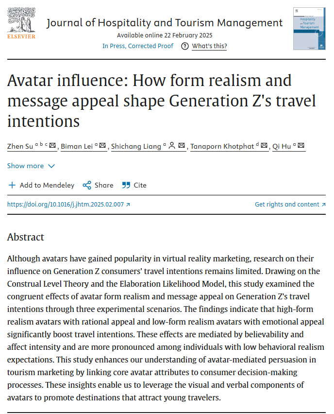 近日,公司苏振副教授科研团队在人工智能与文旅消费者行为领域研究取得新进展,研究成果以“Avatar influence: How form realism and message appeal shape Generation Z's travel intentions”为题,在旅游管理国际高水平期刊《Journal of Hospitality and Tourism Management》上发表。论文的第一作者为苏振副教授,通讯作者为梁世昌副教授。威廉希尔体育为第一单位和通讯单位。
