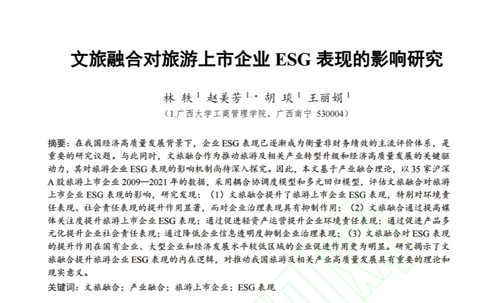 近日,公司林轶教授科研团队在文旅融合与旅游企业ESG表现领域研究取得新进展,研究成果以《文旅融合对旅游上市企业ESG表现的影响研究》为题,在旅游管理领域高水平期刊《旅游科学》上网络首发。林轶为第一作者,硕士研究生赵美芳、胡琰、王丽娟参与研究并共同发表论文,威廉希尔体育为第一单位和通讯单位。